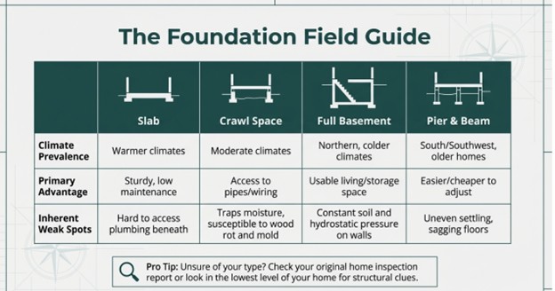 Before you inspect anything, it helps to know what kind of foundation your home sits on. Different types have different weak spots, and knowing yours will help you focus your inspection in the right places.