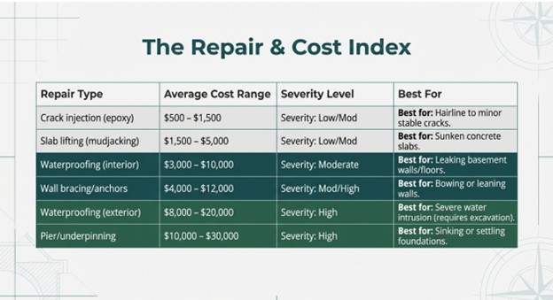Small cracks that are stable and not letting water in can often be sealed with epoxy injection or polyurethane foam. This is a relatively low-cost fix when done early. Waiting until cracks widen or multiply will increase the cost significantly.