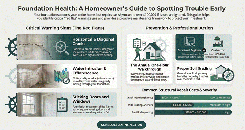 - Learn the warning signs, especially horizontal cracks, bowing walls, and sticking doors